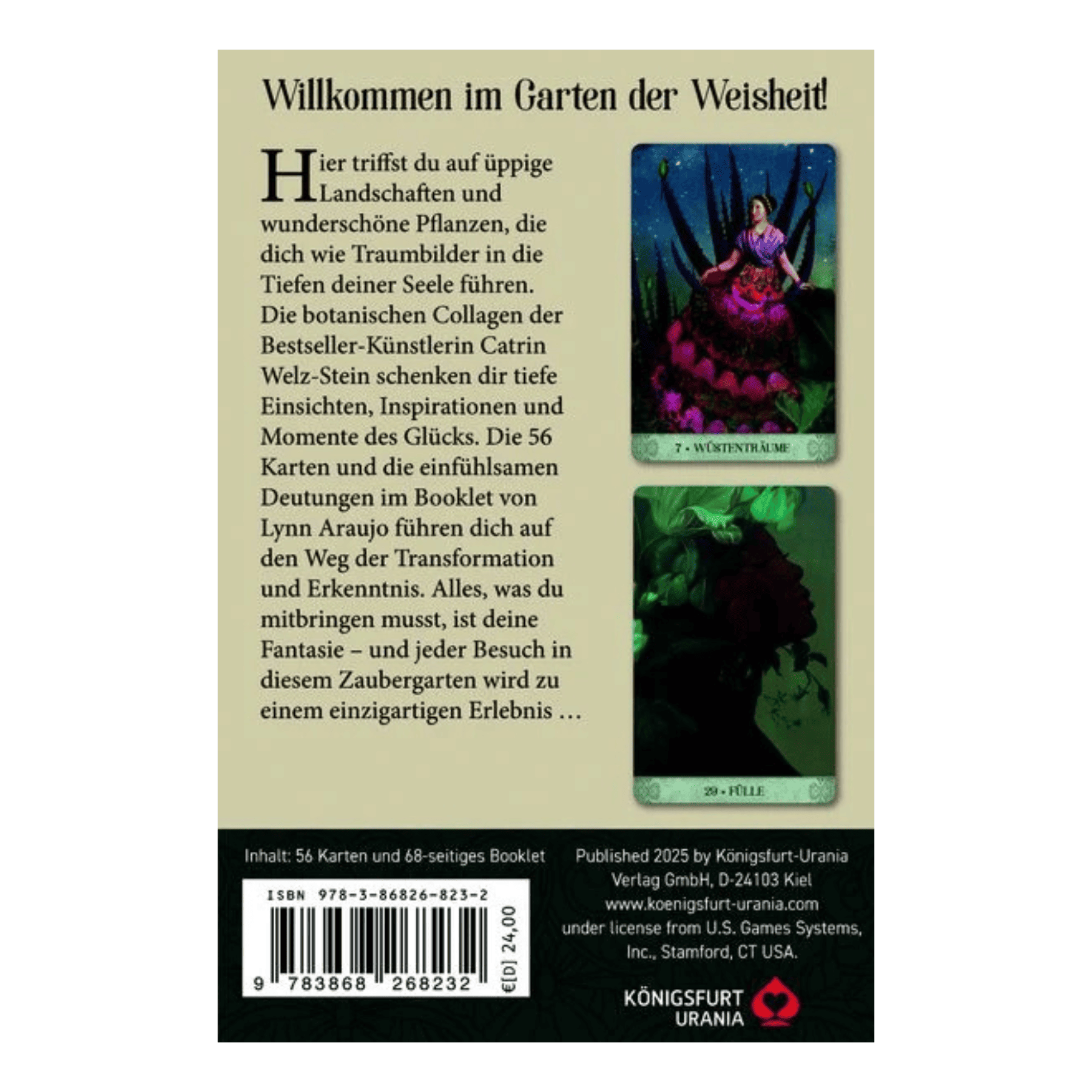 Willkommen im Garten der Weisheit! Hier triffst du auf üppige Landschaften und wunderschöne Pflanzen, die dich wie Traumbilder in die tiefen deiner Seele führen. Die botanischen Collagen der Bestseller-Künstlerin Catrin Welz-Stein schenken dir tiefe Einsichten, Inspirationen und Momente des Glücks. Die 56 Karten und die einfühlsamen Deutungen im Booklet von Lynn Araujo führen dich auf den Weg der Transformation und Erkenntnis. Alles, was du mitbringen musst, ist deine Fantasie – und jeder Besuch in diesem Zaubergarten wird zu einem einzigartigen Erlebnis…