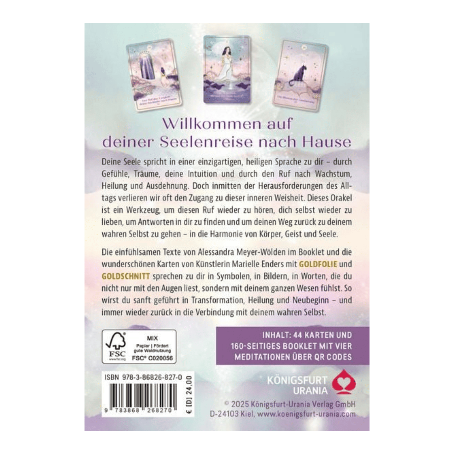Mit „Die Sprache deiner Seele“ hat Alessandra Meyer-Wölden ein einzigartiges Orakel-Set erschaffen, das dich mit deiner inneren Weisheit verbindet und dich auf deinem Weg der Selbstfindung begleitet. Jede der wunderschön gestalteten Karten spricht in Symbolen, Bildern und Worten zu dir, nicht nur zum Lesen, sondern auch zum Fühlen. Dieses Kartendeck hilft dir, deine Intuition zu stärken, Antworten in dir zu finden und dich mit der Sprache deiner Seele zu verbinden. Ergänzt durch ein ausführliches Booklet mit einfühlsamen Texten, kraftvollen Ritualen, geführten Meditationen und Affirmationen, wird es zu einem wertvollen Begleiter für deine persönliche Reise der Transformation. Die kunstvollen Illustrationen von Marielle Enders, elegant veredelt mit Goldfolie und Goldschnitt, machen dieses Orakel zu einem ganz besonderen spirituellen Schatz.